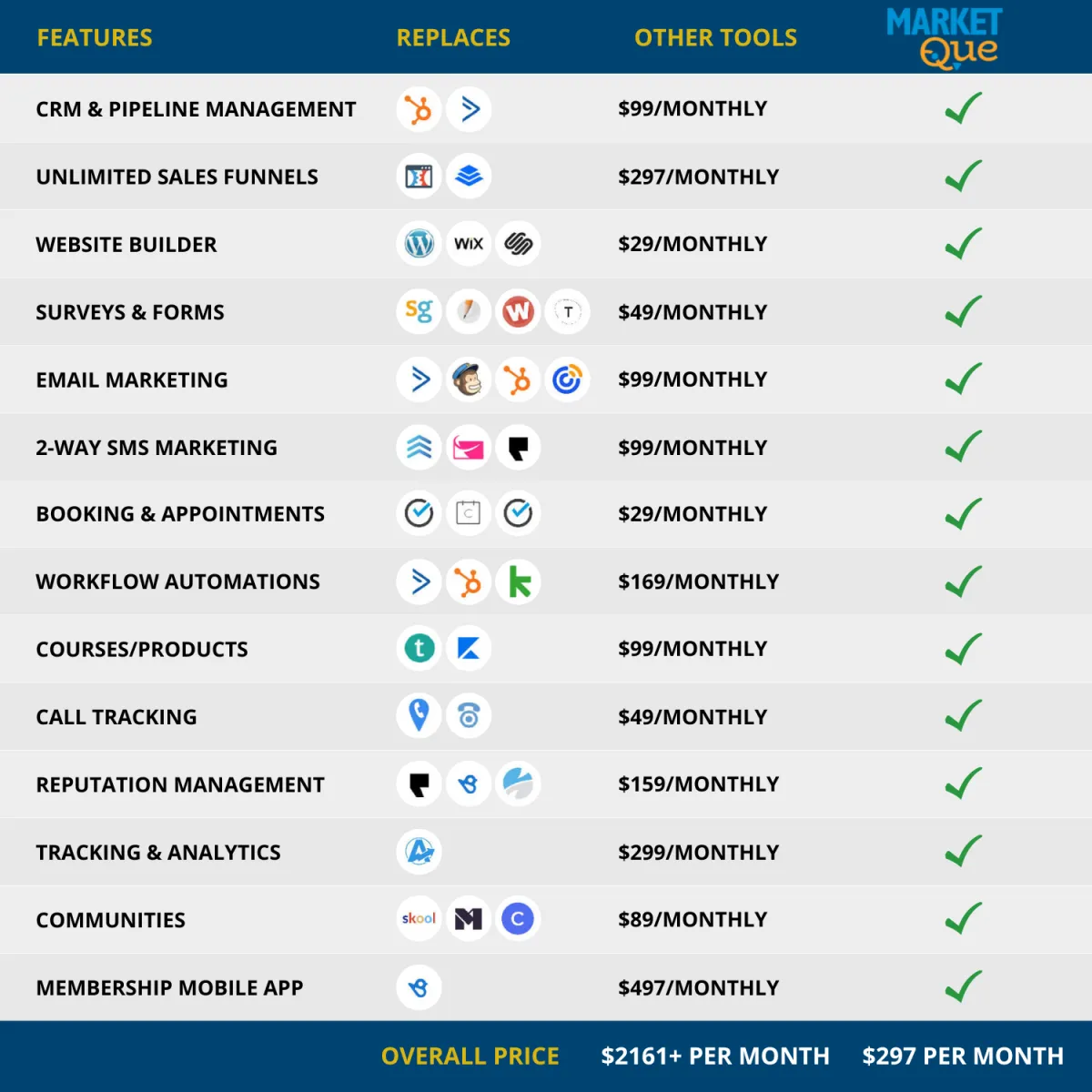 The Market Que Platform is everything that business companies need to manage their leads, websites, funnels, calendars and many other services that are needed to